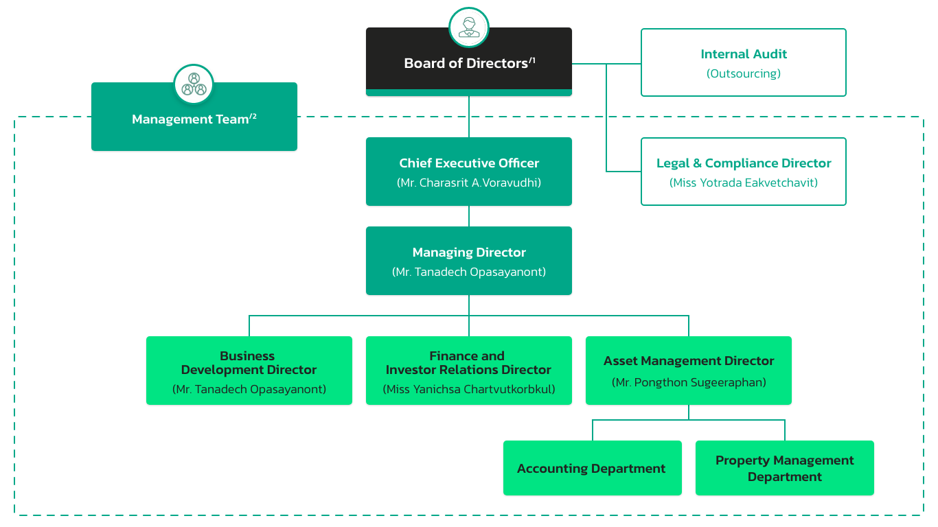 | /1 | Board of Directors As of 12 December 2024, REIT Manager had only the Board of Directors which is comprised of five qualified members as named below. 1. Mr. Thanachai Santichaikul, Chairman of the Board and Independent Director 2. Mr. Paisit Kaenchan, Independent Director 3. Mr. Amorn Chulaluksananukul, Director 4. Mr. Charasrit A.Voravudhi, Director 5. Mr. Tanadech Opasayanont, Director Directors with signing authority: Mr. Amorn Chulaluksananukul, Mr. Charasrit A.Voravudhi, and Mr. Tanadech Opasayanont together, two of these directors, jointly execute their signatures [and affix the company seal]. |