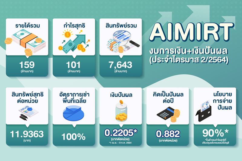 กองทรัสต์ ‘AIMIRT’ ชูผลงานไตรมาส 2/2564 แข็งแกร่งอย่างต่อเนื่อง ท่ามกลางความผันผวนทางเศรษฐกิจ ทำรายได้รวม 159 ล้านบาท กำไรจากการลงทุนสุทธิ 101 ล้านบาท หลังรับรู้รายได้โครงการเจดับเบิ้ลยูดี นวนคร ตั้งแต่เดือนเมษายนที่ผ่านมา คาดแนวโน้มรายได้ไตรมาส 3/2564 เติบโตโดดเด่นต่อเนื่องตามเป้า มั่นใจหลังเพิ่มทุนจะช่วยเพิ่มศักยภาพความแข็งแกร่งแก่กองทรัสต์ ‘AIMIRT’